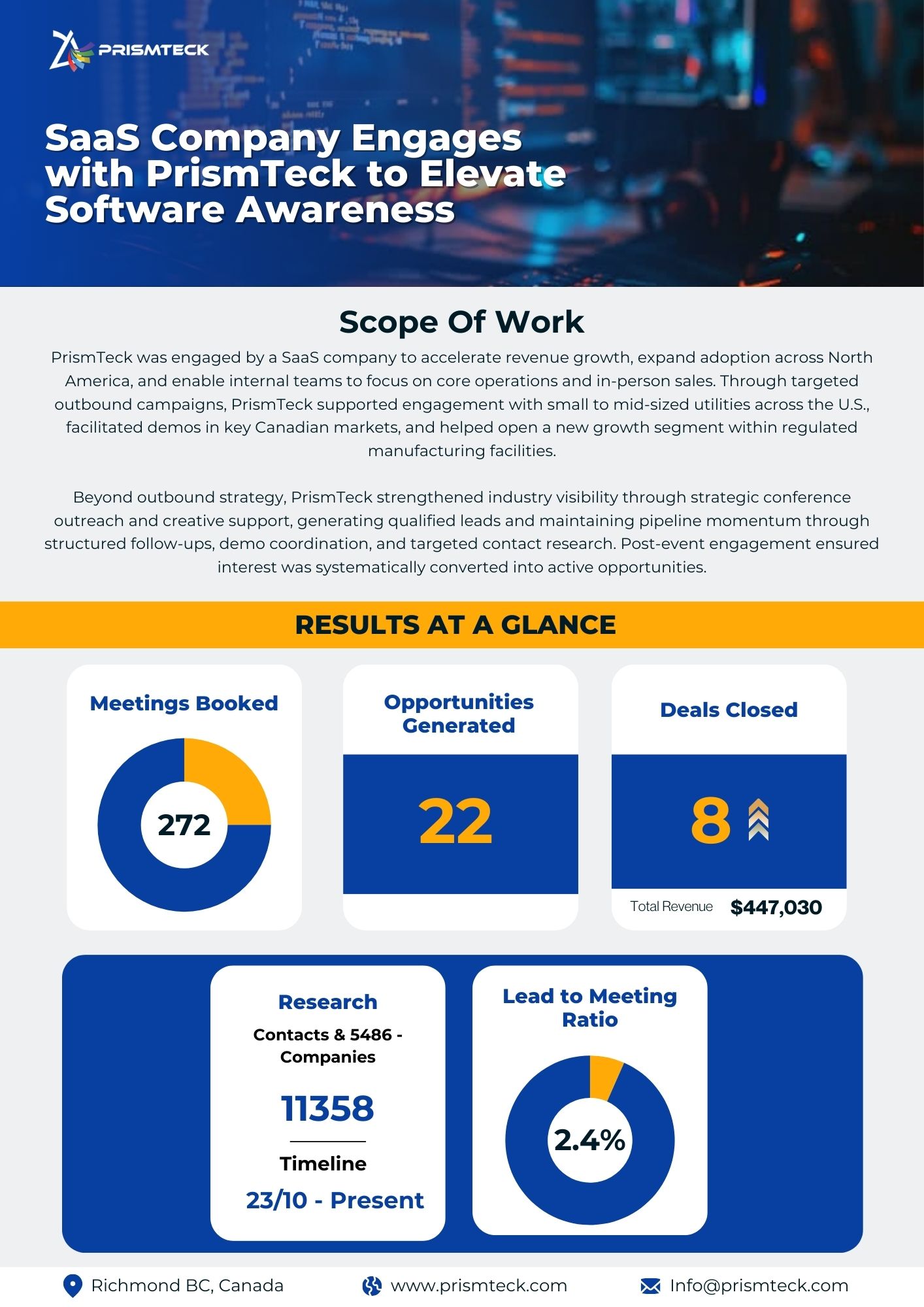 PrismTeck drives B2B growth through data-driven lead generation, sales acceleration, and CRM optimization—penetrating new sectors and regions while fostering strong client relationships with personalized outreach and efficient follow-ups.